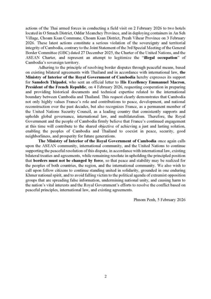 (ភ្នំពេញ)៖ ក្រសួងមហាផ្ទៃ នៅព្រឹកថ្ងៃទី៥ ខែកុម្ភៈ ឆ្នាំ២០២៦នេះ បានឲ្យដឹងថា គិតចាប់ពីម៉ោង៦ព្រឹក ថ្ងៃទី៤ ខែមករា ដល់ម៉ោង៦ព្រឹក ថ្ងៃទី៥ ខែកុម្ភៈ ឆ្នាំ២០២៦នេះ មានពលរដ្ឋភៀសសឹក២,៣៨៨នាក់បន្ថែមទៀត បានបន្តវិលត្រឡប់ទៅលំនៅឋានវិញ ដូច្នេះក្នុងចំណោមពលរដ្ឋភៀសសឹកសរុបជាង៦សែន៤ម៉ឺននាក់ មានប្រមាណ៥សែន៥ម៉ឺននាក់ បានវិលត្រឡប់ទៅលំនៅឋានវិញ។ ពលរដ្ឋភៀសសឹកបន្តស្នាក់នៅជំរំមានចំនួន៩៥,៤៧៤នាក់ ក្នុងនោះស្រ្តីមាន៤៩,៩៩១នាក់ និងកុមារ៣០,៥៣២នាក់។ ការភៀសសឹកទ្រង់ទ្រាយធំបែបនេះ បានធ្វើឲ្យប៉ះពាល់យ៉ាងធ្ងន់ធ្ងរ ទាំងផ្នែកមុខរបរ សុខុមាលភាព សាធារណៈ សិទ្ធិលំនៅឋាន ជាពិសេសសិទ្ធិទទួលបានការសិក្សារបស់កុមារ និងប៉ះទង្គិចផ្លូវចិត្តដ៏គួរឲ្យព្រួយបារម្ភ។ ជាងនេះទៅទៀត ពលរដ្ឋភៀសសឹកខ្លះ វិលដល់ភូមិករមែន ប៉ុន្តែត្រូវបង្ខំចិត្តស្នាក់នៅក្នុងជំរុំបណ្ដោះអាសន្នជាថ្មីទៀត ដោយសារផ្ទះសំបែងបានខូចខាតខ្ទេចរាបដល់ដី និងពោរពេញដោយសំណល់យុទ្ធភណ្ឌមិនទាន់ផ្ទុះរបស់យោធាថៃ។ ខាងក្រោមនេះ ជាសេចក្ដីប្រកាសព័ត៌មានរបស់ក្រសួងមហាផ្ទៃ៖