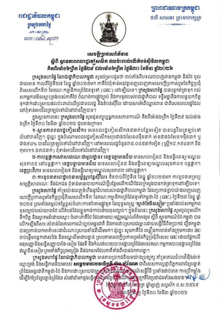 (ភ្នំពេញ)៖ ក្រសួងមហាផ្ទៃ នៅថ្ងៃទី៣០ ខែមីនា ឆ្នាំ២០២៦នេះ បានឲ្យដឹងថា គិតចាប់ពីម៉ោង ៦ព្រឹក ថ្ងៃទី២៩ ដល់ម៉ោង៦ព្រឹក ថ្ងៃទី៣០ ខែមីនា ឆ្នាំ២០២៦នេះ មានប្រជាពលរដ្ឋភៀសសឹក ៧៩នាក់បន្ថែមទៀត បានវិលត្រឡប់ទៅលំនៅឋានវិញ។ ដូច្នេះក្នុងចំណោមពលរដ្ឋភៀសសឹក សរុបជាង៦សែន ៤ម៉ឺននាក់ មានជាង ៦សែន ១ម៉ឺននាក់ ស្មើជាង ៩៤ភាគរយ បានវិលត្រឡប់ទៅលំនៅឋានវិញ។ ពលរដ្ឋភៀសសឹកបន្តស្នាក់នៅជំរំមានចំនួន ៣៥ ០៤៥នាក់ទៀត (ស្រី្ត ១៨.១៩៤នាក់ និងកុមារ ១១.៦៣៨នាក់) ពុំទាន់អាចវិលទៅលំនៅឋានវិញ។ ការភៀសសឹកទ្រង់ទ្រាយធំបែបនេះ បានធ្វើឲ្យប៉ះពាល់យ៉ាងធ្ងន់ធ្ងរ ទាំងផ្នែកមុខរបរ សុខុមាលភាព សាធារណៈ សិទ្ធិលំនៅឋាន ជាពិសេសសិទ្ធិទទួលបានការសិក្សារបស់កុមារ និងប៉ះទង្គិចផ្លូវចិត្តដ៏គួរឲ្យព្រួយបារម្ភ។ ជាងនេះទៅទៀតពលរដ្ឋភៀសសឹកខ្លះ វិលដល់ភូមិករមែន ប៉ុន្តែត្រូវបង្ខំចិត្តស្នាក់នៅក្នុងជំរុំបណ្ដោះអាសន្នជាថ្មីទៀត ដោយសារផ្ទះសំបែងបានខូចខាតខ្ទេចរាបដល់ដី និងពោរពេញដោយសំណល់យុទ្ធភណ្ឌមិនទាន់ផ្ទុះរបស់យោធាថៃ៕ ខាងក្រោមនេះ ជាសេចក្ដីប្រកាសព័ត៌មានរបស់ក្រសួងមហាផ្ទៃ៖